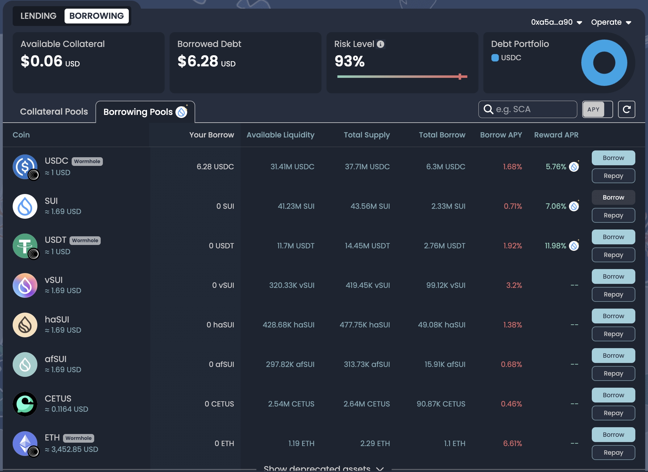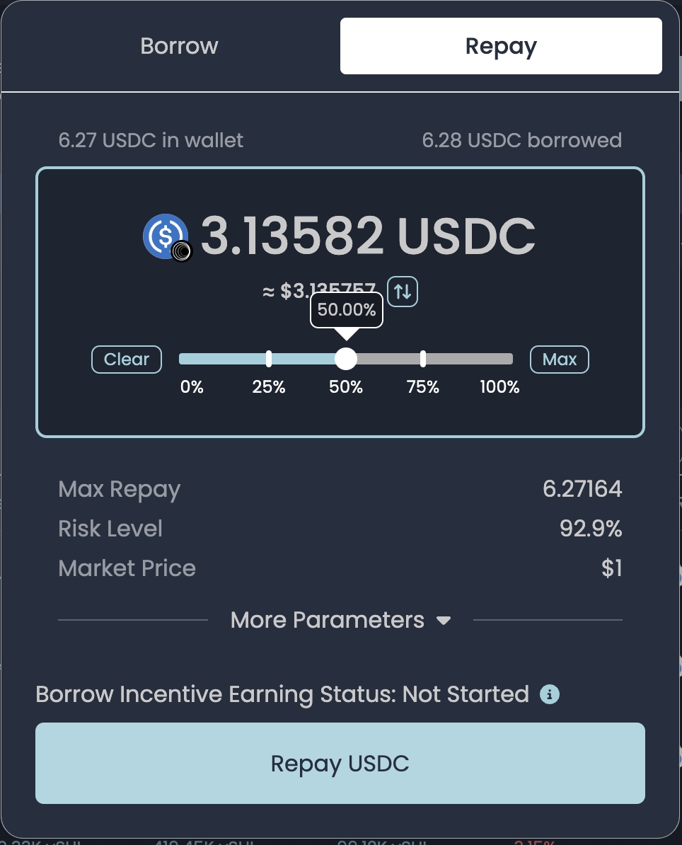 在這個例子中,債務本的風險水平已達到93%,如果超過100%,我們的抵押資產將被清算。為了防止這種情況發生,我們可以償還之前借入的資產。由於借入的資產僅有USDC,我們可以償還這種資產以降低風險水平百分比。