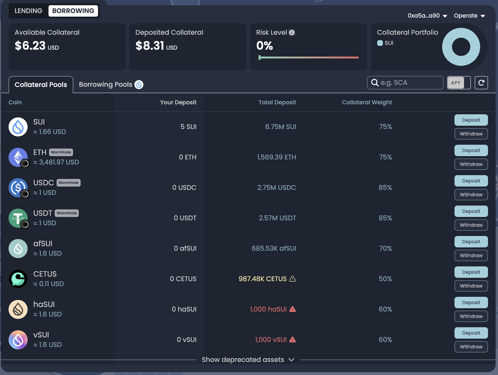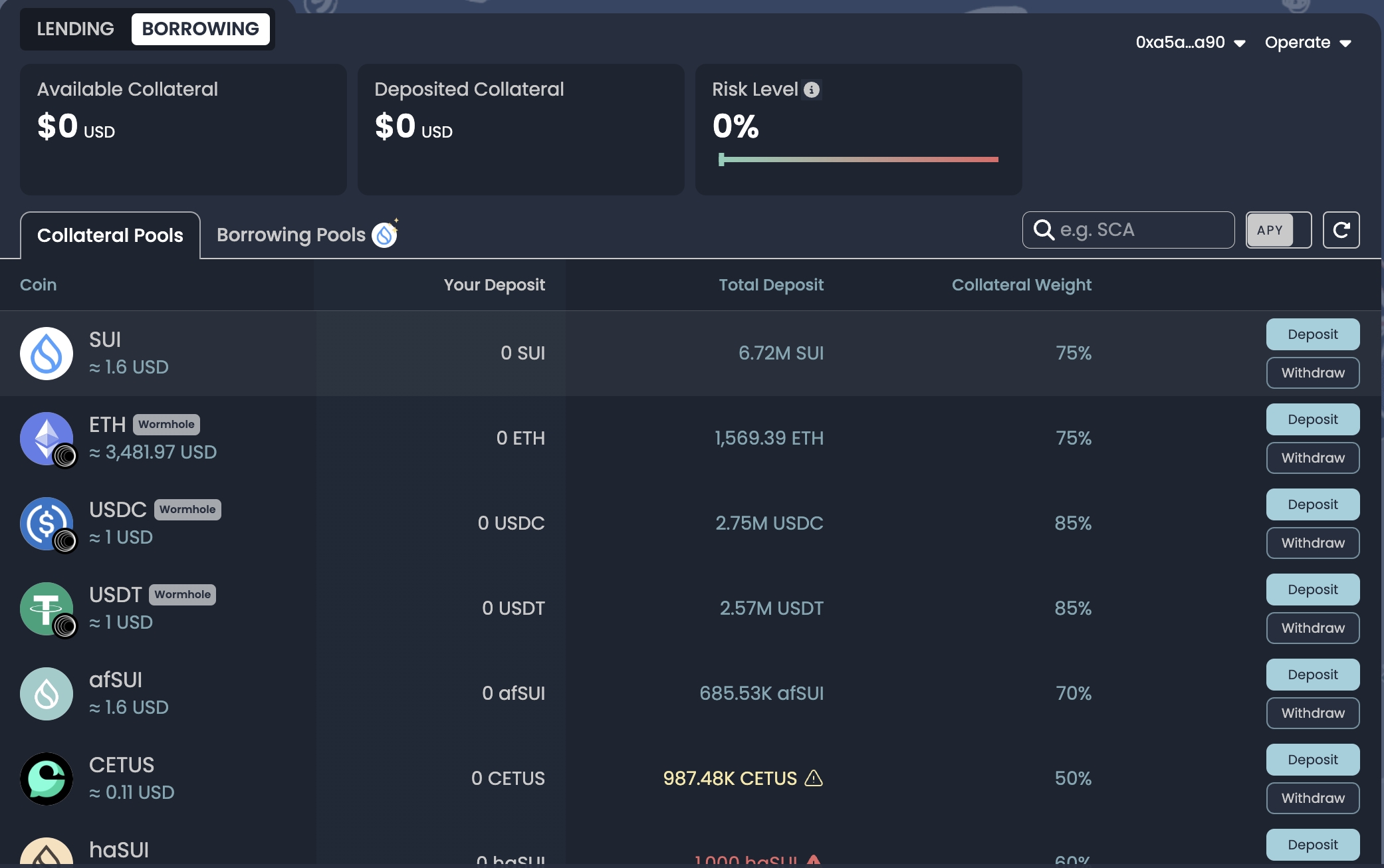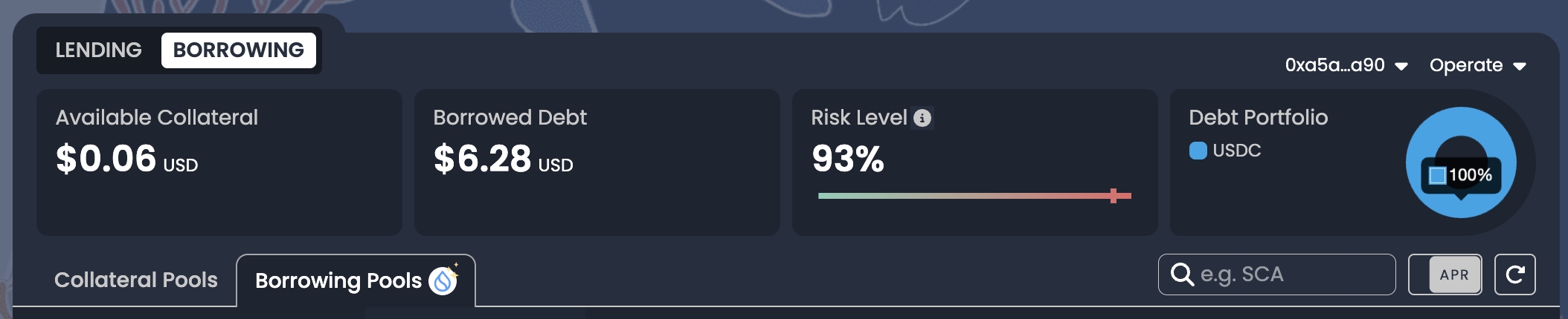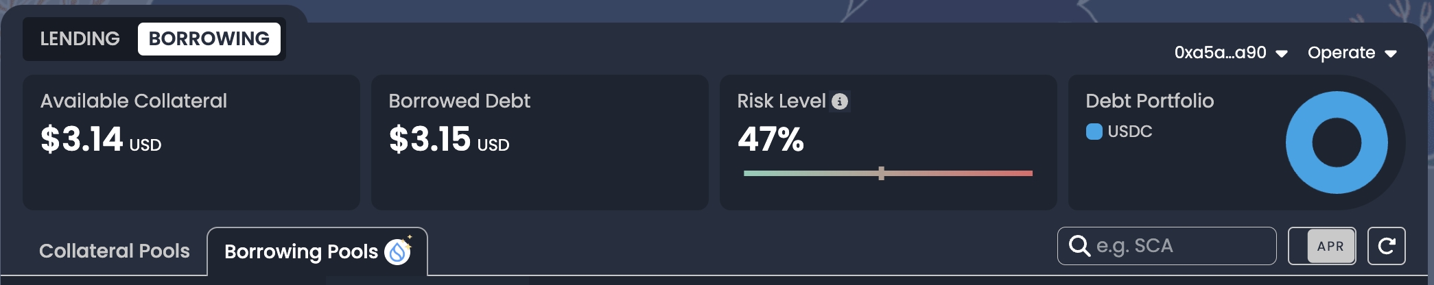 在將資產存入抵押池後,您可以從借貸池中選擇您想借的資產。輸入您想從借貸池中借出的金額,並考慮到借款金額越高,您的債務風險水平就越高,這可能導致您的債務本被清算。