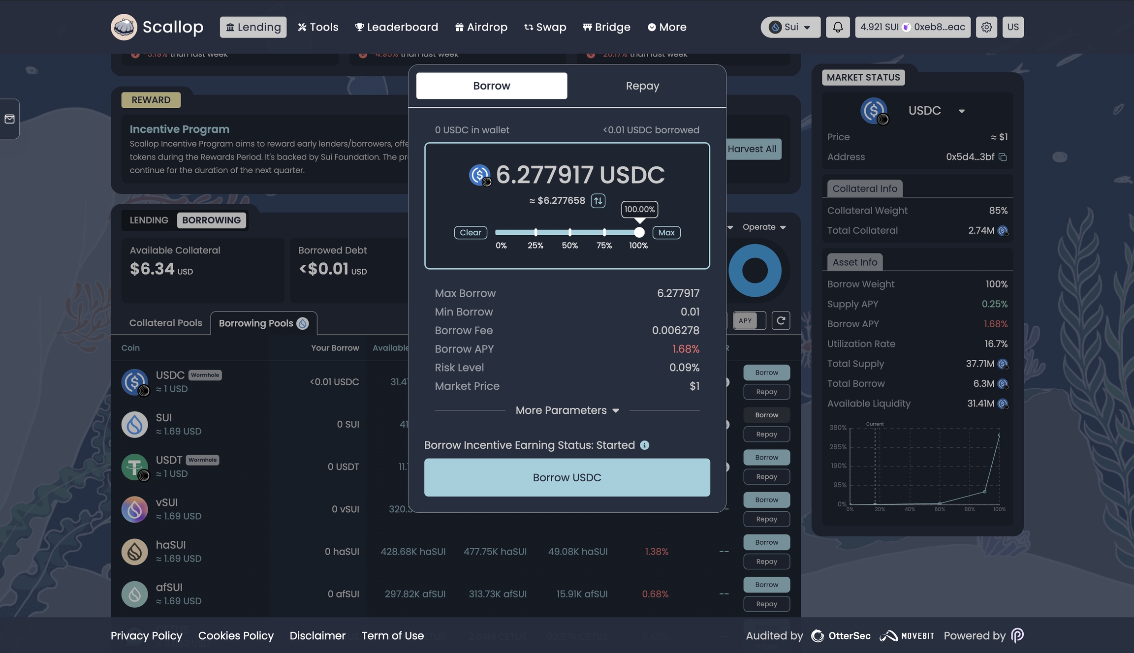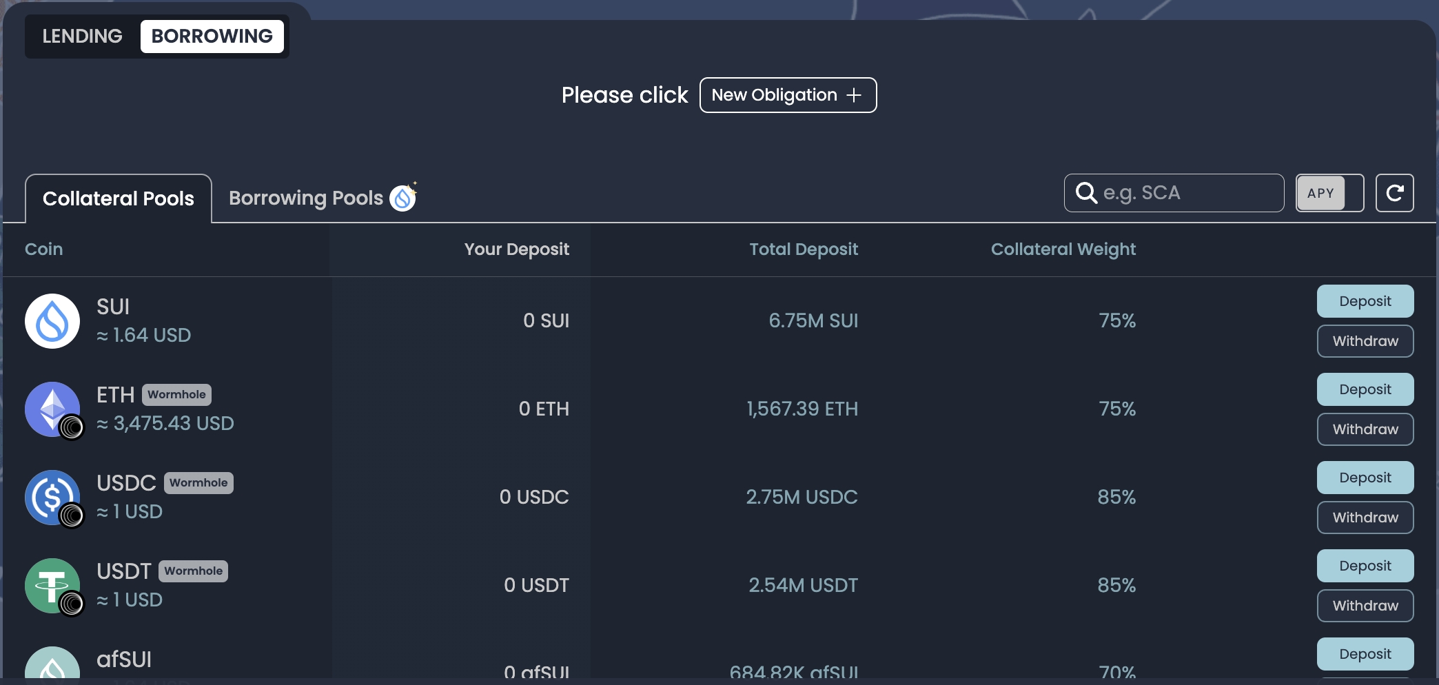 在 Scallop 平台上借款時,您需要先存入抵押品,以便借到所需的資產。然而,在進行存款和借款之前,您需要先創建一個債務。