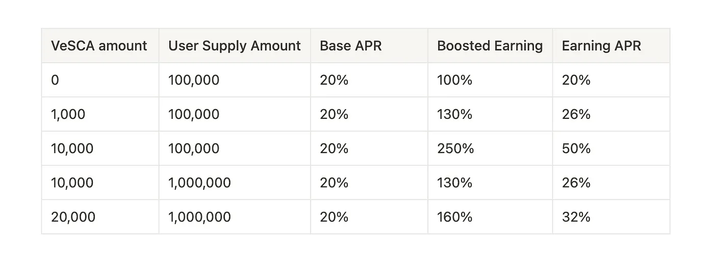 用戶可以通過持有 veSCA 來提高他們的收益。當他們將資金存入提供激勵的池中時,需要持有 veSCA。例如,如果一個池子為存入流動性提供 20% 的年利率(APR),持有一定數量的 veSCA 可以提供增益,例如最高可達 5 倍。最初的年利率是 20%,在經過 5 倍增益後,年利率將變為 100%。