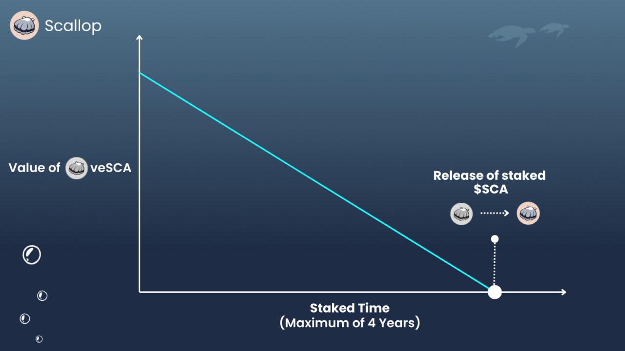 Scallop 採用一種被普遍稱為Vesting Model的 $SCA 代幣的鎖定機制,其衍生品為 veSCA,通過持有 veSCA,擁有者可以解鎖持有 $SCA的好處,讓代幣變得更加有用。
